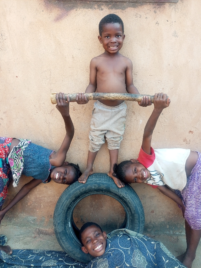 Four smiling children playfully interact with a tire and a wooden bar against a neutral-colored wall. A shirtless boy stands on the tire, holding the wooden bar horizontally. Two girls lean over the tire, each holding an end of the bar. The fourth child lies beneath the tire, wrapped in a blue patterned fabric, also smiling. They appear to be engaged in a game, exuding happiness.