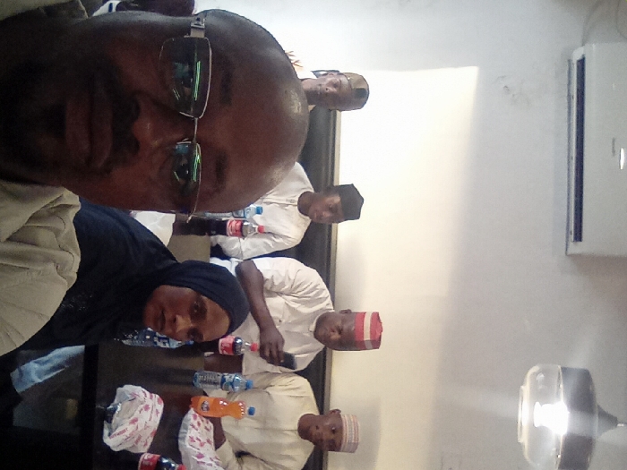 A man wearing sunglasses and light shirt is taking a selfie with a group of people. A woman in a black hijab is to his left. Behind them sit four men in white shirts and caps. There are several bottles of water and soda on the table, along with other items. The background is mostly white, with a white air conditioning unit on the wall. A fan sits on the floor to the right.