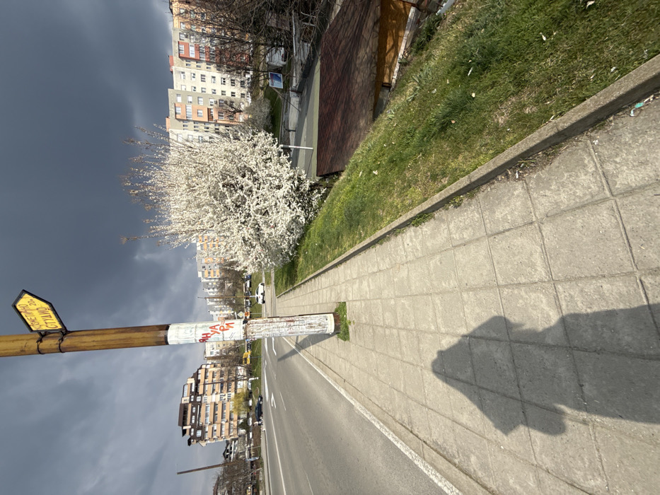 The image depicts an outdoor street scene in Blagoevgrad, Bulgaria, under a partially overcast sky with prominent dark storm clouds. In the foreground, a distinct shadow of a person, likely the photographer, is cast on a gray concrete slab sidewalk extending from the lower left towards the upper center. A tall, brown utility pole stands centrally on the sidewalk, leaning slightly left, with its lower section wrapped in white material displaying red graffiti that reads "ЯНУАРИ" (January). Attached to the pole at eye level is a yellow, arrow-shaped sign pointing right, with black text indicating "КОСМЕТИЧНО СТУДИО 20ч." (Cosmetic Studio 20h). To the left of the sidewalk is a paved road, likely a multi-lane thoroughfare, with a solid white line separating it from the pedestrian area and a broken white line further into the street. Several vehicles, including a white car, are visible on the road in the mid-distance. To the right of the sidewalk, a grassy bank slopes downwards. A large, deciduous tree covered in white blossoms, indicative of springtime, is prominently situated on this bank. Beyond the bank and the tree, in the midground, are several multi-story apartment buildings of varying designs and pastel colors (pink, yellow, blue, white, brown), characteristic of urban Bulgarian architecture. Below the grassy bank, partially obscured, are sections of a small, open court area and the reddish-brown tiled roof of a smaller structure. The background is dominated by a dramatic sky, featuring bright patches transitioning into dark, heavy storm clouds concentrated on the right side of the frame.