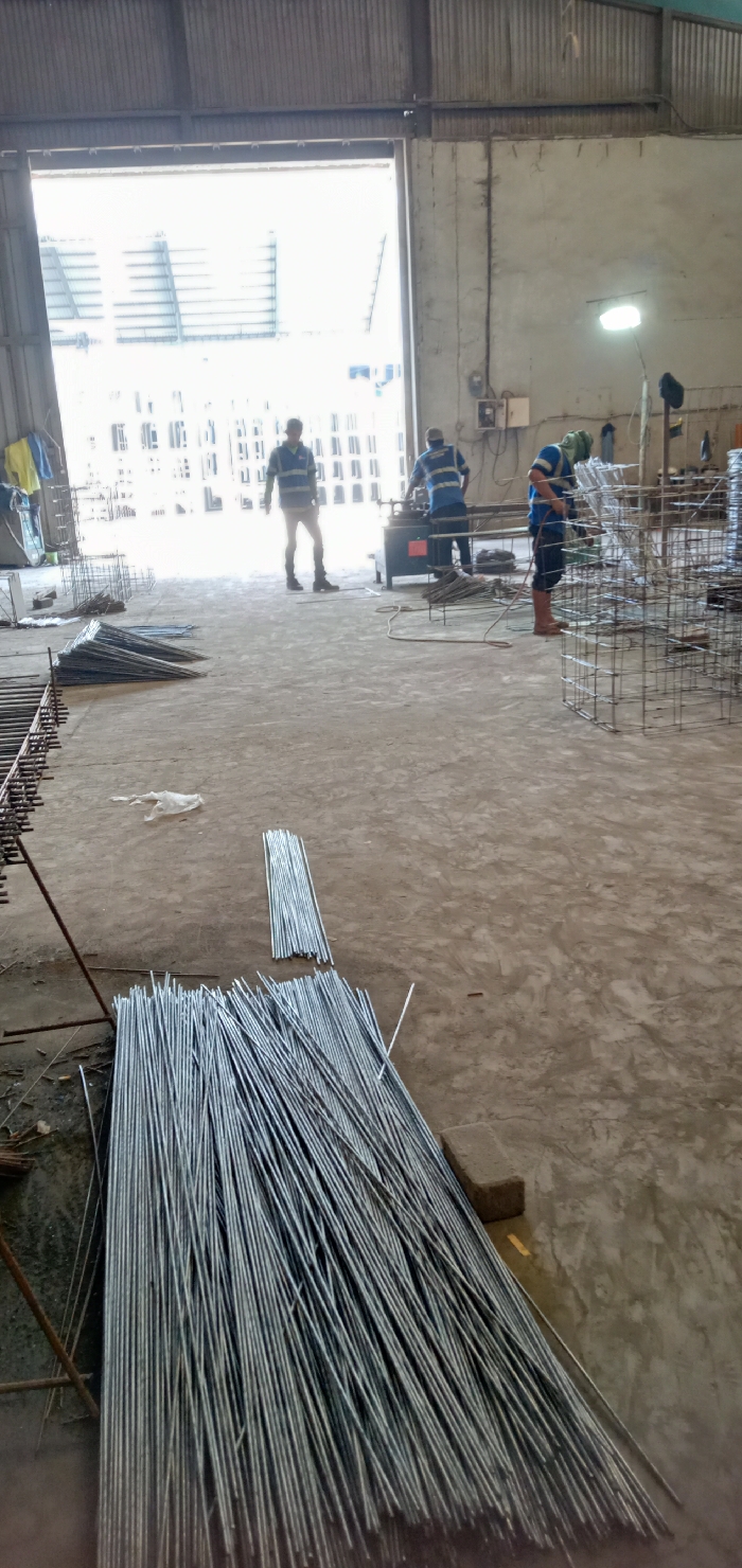 This image depicts an interior view of a rebar fabrication workshop or industrial facility in Sumput, Indonesia