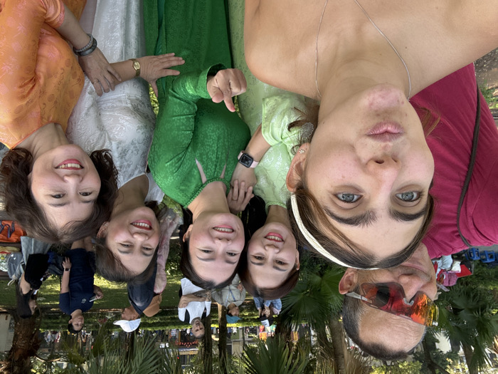 A group of seven individuals posing closely together for a selfie-style photograph. They are arranged in a row, with each person’s face visible. Six of the people are Asian women in traditional Vietnamese Ao Dai dresses of different colors. A fair-skinned woman in a pink shirt and a man with sunglasses join the group. The background shows a park-like setting with trees, grass, and people. The image is rotated, making the sky appear at the bottom.