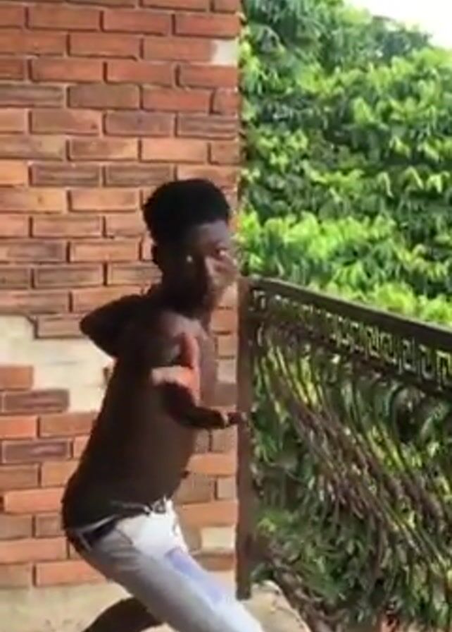 A young, muscular, Black man is dancing and performing a mock karate routine on a small balcony of a brick house