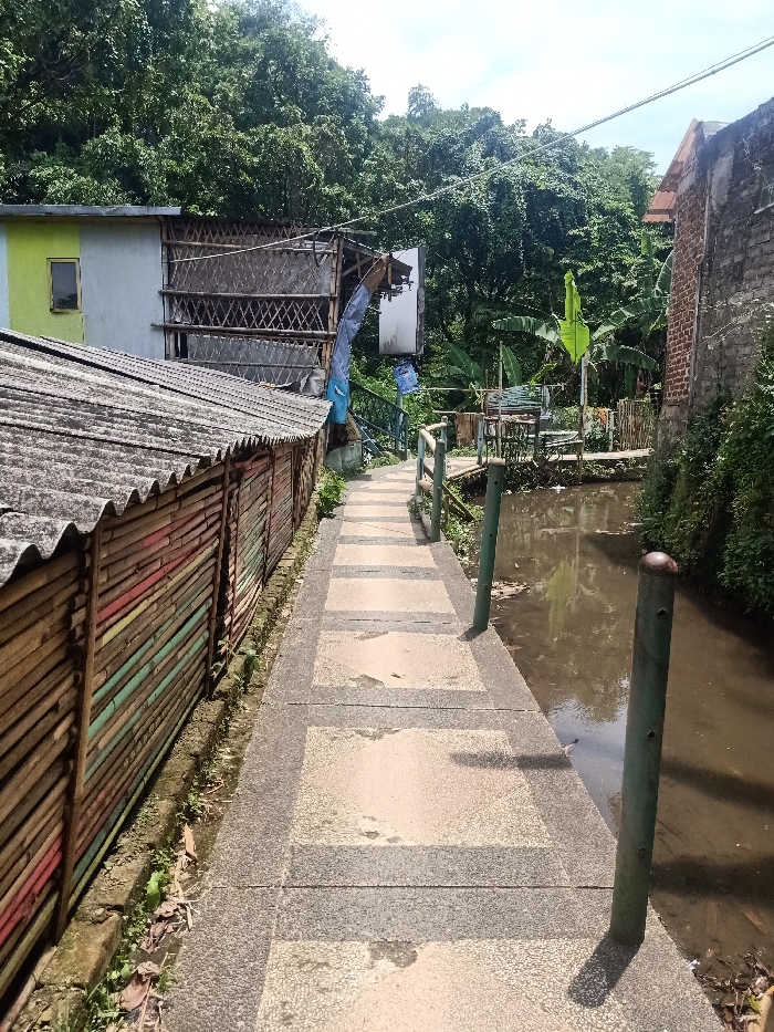 A narrow, elevated walkway leads through a village setting. The path, paved with alternating gray and beige slabs, runs between a bamboo fence on the left and a murky waterway on the right. Green poles line the waterway. Buildings, one with a green accent wall, stand nearby. Lush green trees and foliage fill the background, providing a dense canopy overhead. A small sitting area is visible across the water.