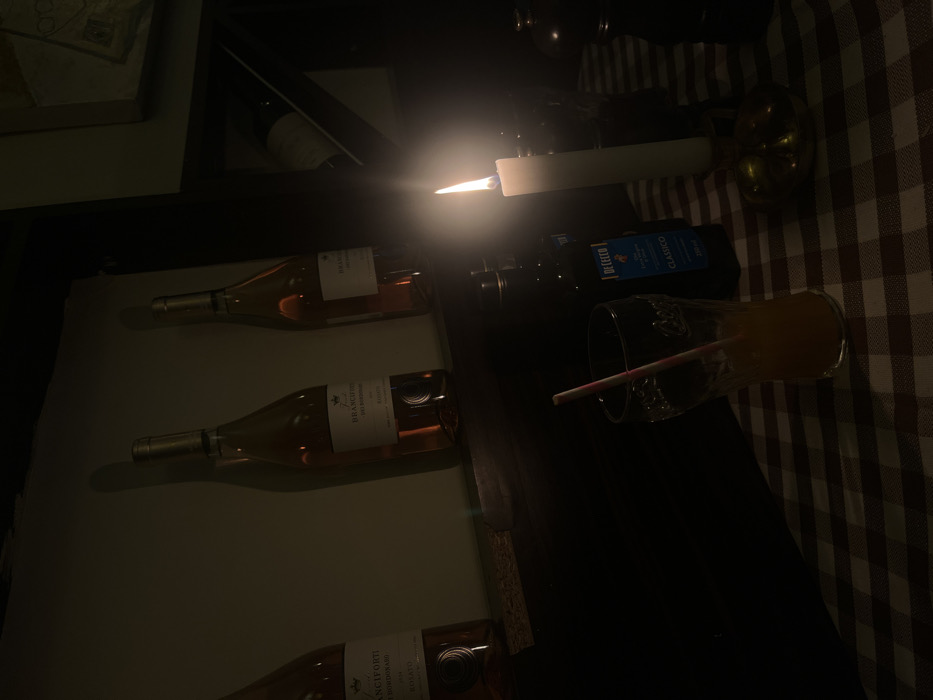 A dimly lit image shows three wine bottles lying horizontally on a white surface. A glass of orange liquid with a straw sits on a dark surface next to a bottle of dark liquid, both near a lit white candle in a holder. A checkered tablecloth is visible on the right side of the frame.