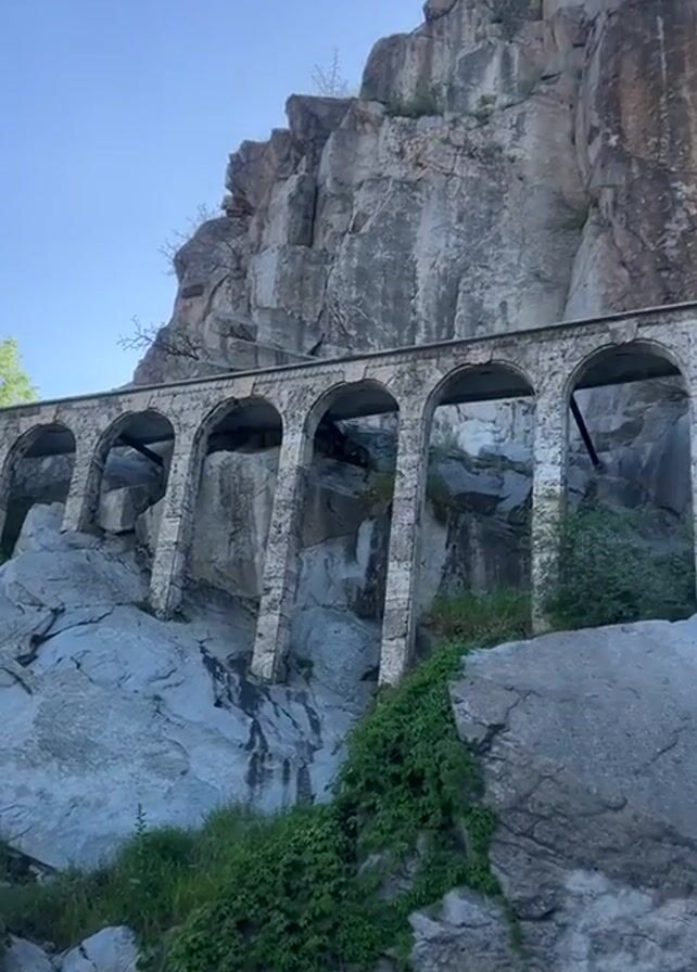 stone aqueduct against a backdrop of rocky cliffs under a clear blue sky. The aqueduct, constructed with rounded arches, is built into the uneven terrain of large, grey boulders and interspersed with patches of greenery. The cliffs rise sharply, topped with sparse vegetation including trees. The camera angle is low, looking up at the structure and the surrounding landscape.