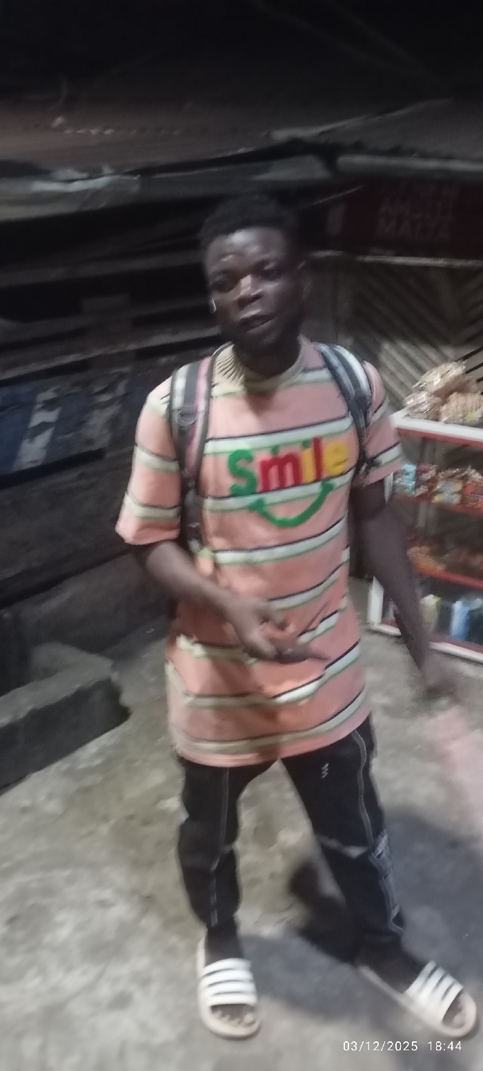A young man with dark hair and skin wears a striped shirt that spells out "smile" with a curved line underneath. He also wears dark pants with stripes on the side, and white Adidas slides. A backpack hangs on his shoulders. The background includes a shelf of snacks and drinks, a concrete structure, and a dim, possibly outdoor setting. The date and time, March 12, 2025 at 18:44, are visible at the bottom right corner.