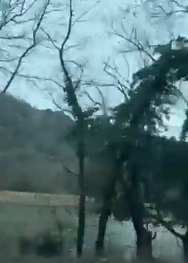 landscape from a moving vehicle. A body of water and a barren hillside are visible. The foreground is filled with trees, some with leaves and some without. The sky is overcast.