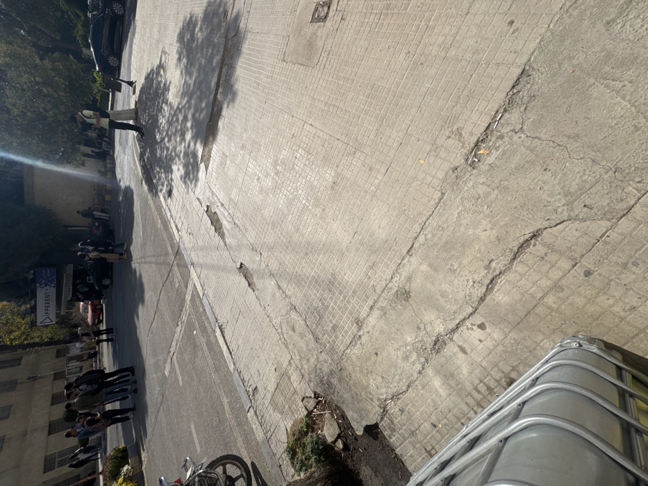 The image displays an urban street scene in Rukn ad-Din Municipality, Syria, under bright daylight with strong shadows. The perspective is from an elevated vantage point overlooking a street and its surroundings. In the immediate foreground, the corner of a large, silver-colored, caged industrial container is partially visible on the bottom left. The foreground sidewalk is composed of light-colored, square-gridded concrete pavers, which show considerable signs of wear, including multiple cracks, uneven sections, and eroded patches. A small area of exposed soil and sparse green vegetation is present at the base of a tree trunk on the far left. The midground features an asphalt street with faint white markings. Several individuals are present: A group of approximately six to eight people is standing on the left sidewalk, near a building, engaged in what appears to be conversation. Across the street, two individuals are visible on the right sidewalk under the shadow of a tree; one person, wearing a light-colored top and dark trousers with a backpack, is standing. Multiple vehicles are parked along the far side of the street, including a red sedan and two dark-colored sedans. The front wheel and part of a motorcycle are visible on the street to the left. The background reveals a multi-story building with multiple windows, where a prominent sign displays the word "DIFFERENT" in white lettering on a dark background. Numerous trees line the far side of the street, casting distinct shadows onto the opposite sidewalk and street. A significant sun flare is present in the upper right portion of the image. The overall infrastructure shows visible signs of age and degradation, particularly on the pedestrian surfaces.