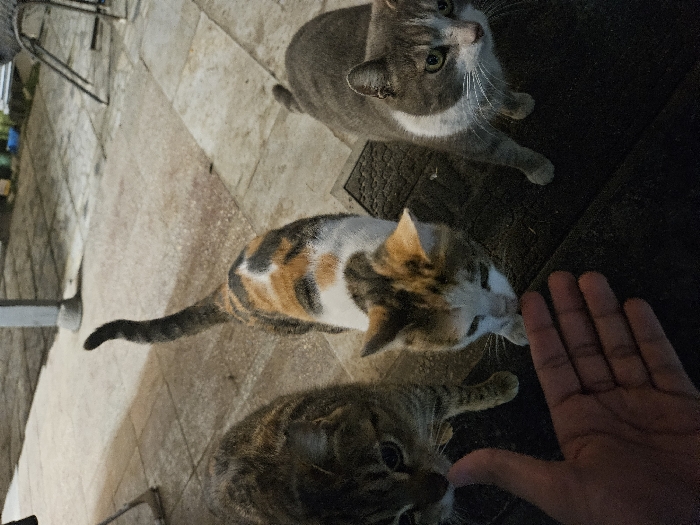 - "The image displays three domestic cats interacting with a human hand on a paved outdoor surface in Botevgrad, Bulgaria" by FM-nJ2682, licensed under CC BY 4.0