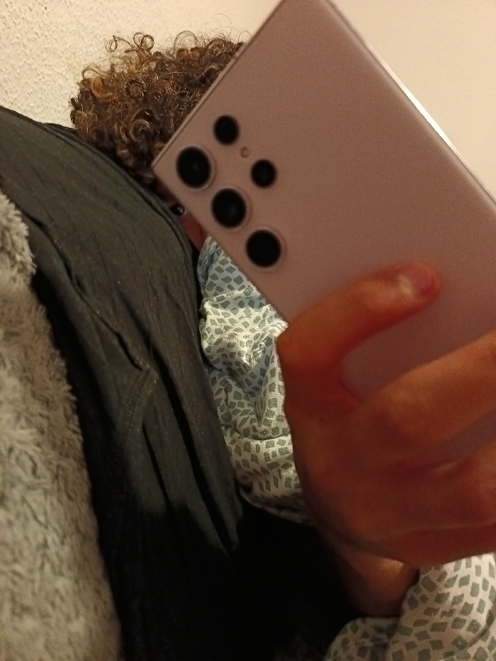 The scene is an indoor environment in Kamenz - Kamjenc, Germany. A person with curly, reddish-brown hair is partially visible on the upper left, positioned in a reclining manner against a light-colored surface. They are partially covered by dark-colored clothing, with a light-colored textile featuring a repeating geometric pattern beneath. To the far left, a gray, textured, plush fabric is present. The person's right hand holds a light lavender-colored smartphone, likely a Samsung Galaxy S23 Ultra or similar, displaying its multi-lens rear camera system. The smartphone screen is oriented away from the viewer. The primary action observed is the holding and apparent observation of the smartphone by the individual.