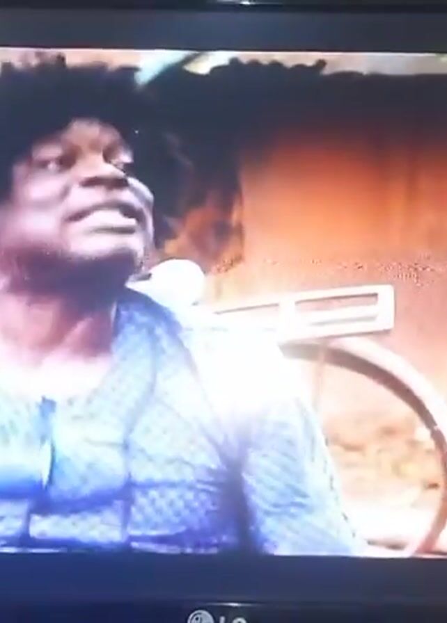 A television displays a scene from a show called EPIC. A man with an afro, wearing a blue patterned shirt, is initially shown next to a bicycle. The scene then shifts to two men, both with afros, seated outdoors against a background of green foliage. One man wears a light tan short-sleeved shirt, while the other wears a light blue long-sleeved shirt and appears to be yelling.