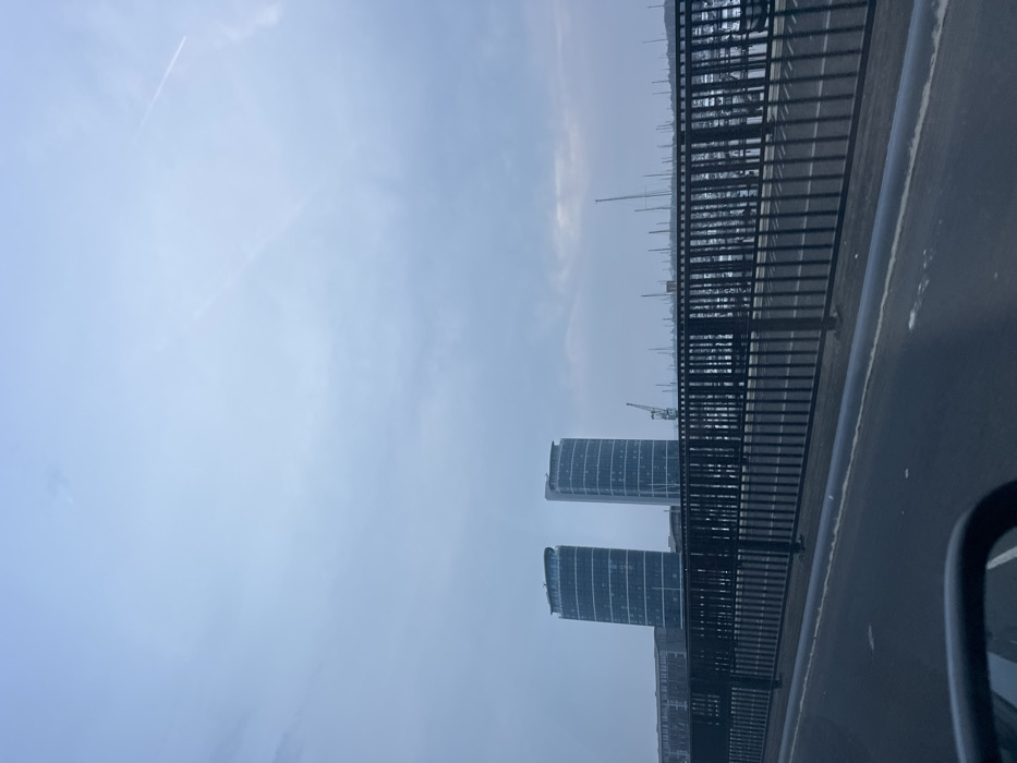 The image displays a waterfront urban landscape at Chatham Maritime, adjacent to Gillingham, United Kingdom. The view is captured from within a vehicle, with the partial reflection of a side mirror visible in the lower left foreground. In the immediate foreground, a dark grey paved surface with a thin white line is visible. A black metal railing, composed of vertical bars, spans horizontally across the middle ground, delineating the edge of a roadway or bridge. Beyond this railing, a marina is densely packed with numerous docked vessels, predominantly sailboats, characterized by their prominent vertical masts. In the background, two tall, modern, cylindrical multi-story buildings with extensive glass exteriors, identified as the Pier Quays Towers, stand against the horizon. To the left of these towers, a lower, elongated building is discernible. A large industrial crane is positioned behind the marina, to the right of the left tower. The sky is uniformly overcast, exhibiting a light grey-blue hue. Faint contrails are present in the upper right portion of the sky. No individuals or active interactions are observed within the frame.