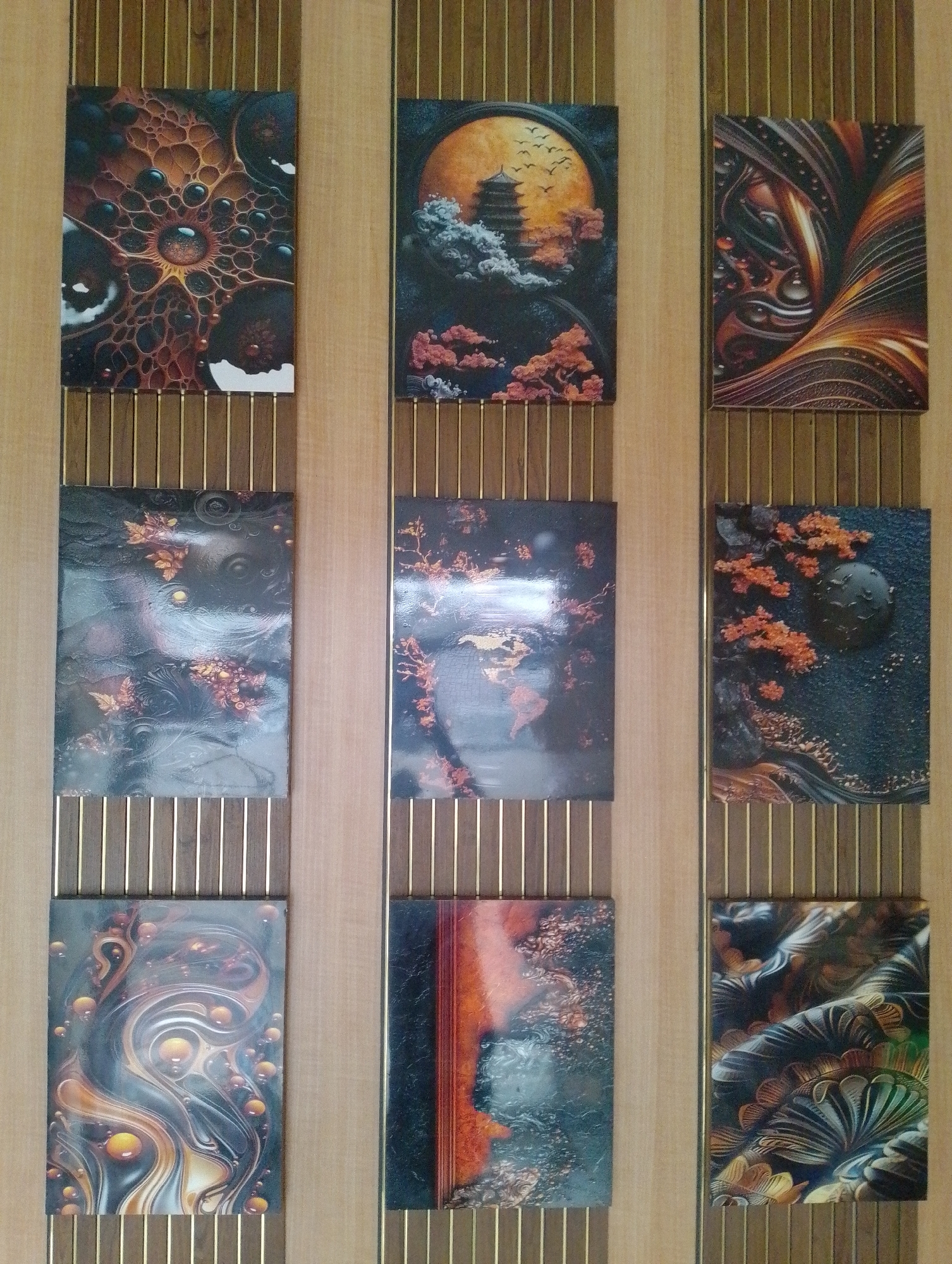 Nine vertical rectangular artworks are displayed on a light-brown paneled wall in an interior setting in Lhokseumawe, Indonesia. The artworks are arranged in a 3x3 grid. Each artwork is mounted on a section of the wall featuring dark brown vertical strips interspersed with thin, golden vertical metallic rods. The artworks exhibit a diverse range of abstract and semi-abstract styles, predominantly in dark, earthy, and warm tones such as black, brown, orange, red, and gold, with occasional highlights of white, grey, and dark green. * **Top row, left to right:** 1. An abstract image depicting organic, cellular, or bubble-like structures in reddish-brown and black, with a central luminous point and white highlights. 2. A stylized landscape featuring a dark pagoda silhouette, a large orange moon or sun, white clouds, and reddish-orange trees against a dark background, with birds in flight. 3. An abstract composition of flowing, interwoven patterns in shades of brown, orange, and dark grey, suggesting textured fabric or abstract forms. * **Middle row, left to right:** 1. A dark, glossy abstract piece with scattered reddish-orange elements resembling foliage or coral, reflecting light. 2. A similar dark, glossy abstract piece, highly reflective, with more dispersed reddish-orange elements. 3. A textured, dark abstract image featuring a rounded, darker sphere-like object surrounded by clusters of reddish-orange elements. * **Bottom row, left to right:** 1. An abstract artwork with swirling dark grey and black patterns, accented by numerous luminous orange spheres and lighter streaks. 2. A dark abstract composition dominated by a vertical, vibrant reddish-orange streak on a textured background with subtle forms. 3. An abstract piece displaying intricate, layered fan-like or petal-like patterns in dark green, brown, orange, and yellow hues, exhibiting strong textural details. No people, discernible actions, or interactions are present in the scene. The environment appears to be a well-lit public or commercial interior space.