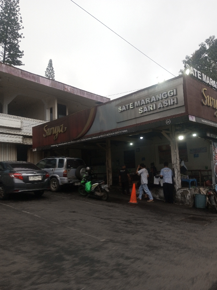 This image depicts a commercial street scene in Tangsibi, Bhutan, under an overcast sky. The foreground features a dark, paved surface, possibly asphalt, with visible tire marks. On the left, a multi-story building with a light-colored lower section and a brown upper section featuring arched window recesses is visible. A tall, slender coniferous tree extends above its roofline. Directly adjacent to it, and extending to the right, is a single-story commercial establishment. This establishment prominently displays two signs: one in gold script reading "Surya" on a reddish-brown background, and another above it, in silver dimensional letters, reading "SATE MARANGGI SARI ASIH" on a grey background. The commercial establishment has an open-fronted area under an awning, illuminated by multiple overhead lights. Several individuals are present in this area: - One person, dressed in a light-colored long-sleeved shirt and dark pants, walks from left to right, near the center. - Another individual, in a dark shirt and light-colored pants, walks from right to left, positioned further back. - A third person in a dark shirt stands near the back left of the open area. - Other figures are partially visible deeper inside the establishment, including one seated at a table on the far right. Vehicles are parked on the paved surface in front of the buildings. A dark grey sedan, bearing the Indonesian license plate "B 8052 BBE," is parked on the far left. Behind it, a silver SUV with a spare tire mounted on its rear hatch is visible. A green and black scooter is parked between the SUV and the commercial building entrance. A second, partially visible motorcycle is parked on the far right. An orange traffic cone stands on the pavement near the entrance of the commercial building. A light blue plastic bin is situated on the far right. Overhead utility lines traverse the upper portion of the frame against the grey sky.