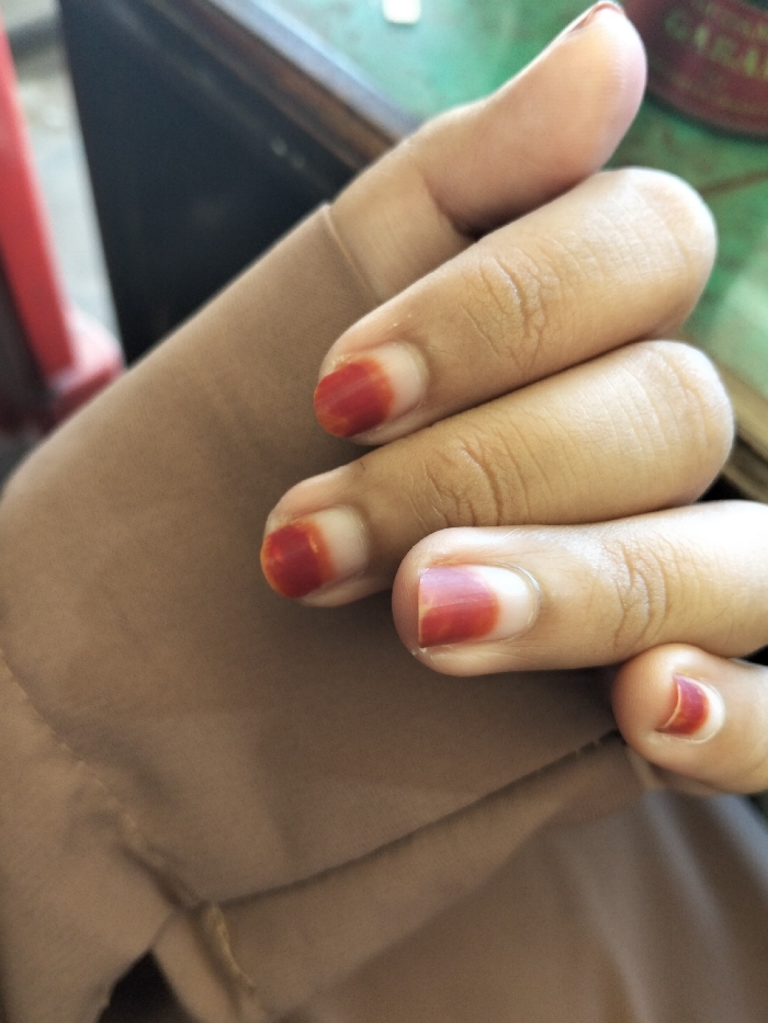 A hand rests on a beige fabric. The fingers are curved, showing nails painted with a reddish-brown hue, fading into the natural nail color at the base. The skin is light brown with visible creases on the knuckles and fingers. The texture of the fabric appears soft, slightly wrinkled, and covers part of the hand. A corner of a wooden surface with green and white writing is faintly visible in the background.