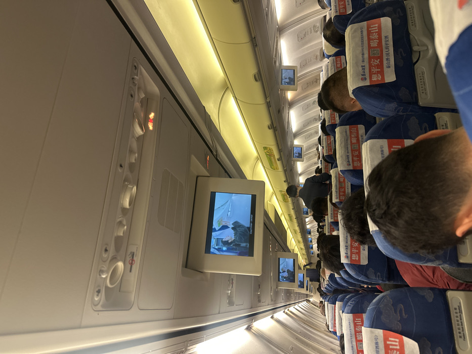 The image displays the interior of a commercial aircraft cabin, viewed from a passenger's perspective looking forward down the main aisle. The setting is within an airplane in Xiaoshan District, China. The cabin is occupied by numerous passengers seated in rows of blue fabric seats, each fitted with white headrest covers. These covers bear Chinese characters, specifically "想平安 喝泰山" (Want peace, drink Taishan) and "泰山" (Taishan), often associated with Mount Tai. Overhead, multiple drop-down LCD screens are active, showing content that includes a person demonstrating a procedure, likely a flight safety video. Above the seating rows, overhead service panels feature individual air vents, reading lights, and illuminated red "no smoking" and "fasten seatbelt" indicator signs. Overhead compartment doors line both sides of the cabin. A male individual, possibly an airline crew member, dressed in a dark suit jacket, stands in the aisle further down the cabin, facing away from the camera. The cabin is uniformly lit by overhead and side panel lighting, creating a warm ambiance.