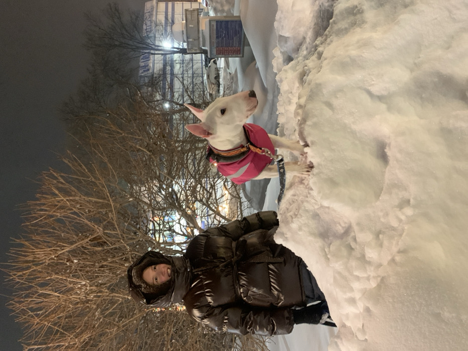 A woman in a black puffer jacket stands next to a large snow bank at night. To her right, a white Bull Terrier wearing a pink jacket stands on the snow. A bare tree is between the woman and the snow bank. Streetlights and buildings are visible in the background.