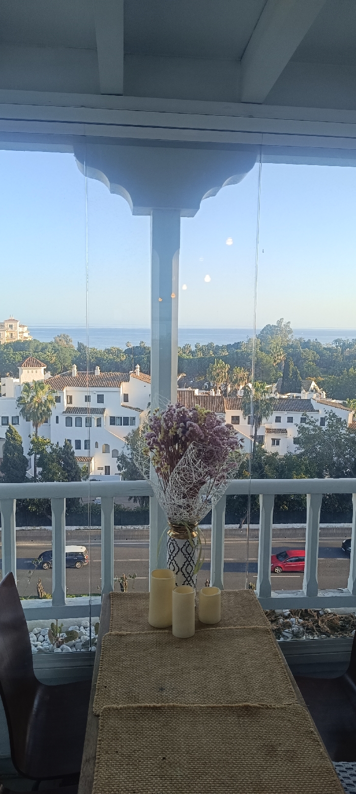 The image displays a high-angle view from an enclosed balcony or terrace, characteristic of Marbella, Spain