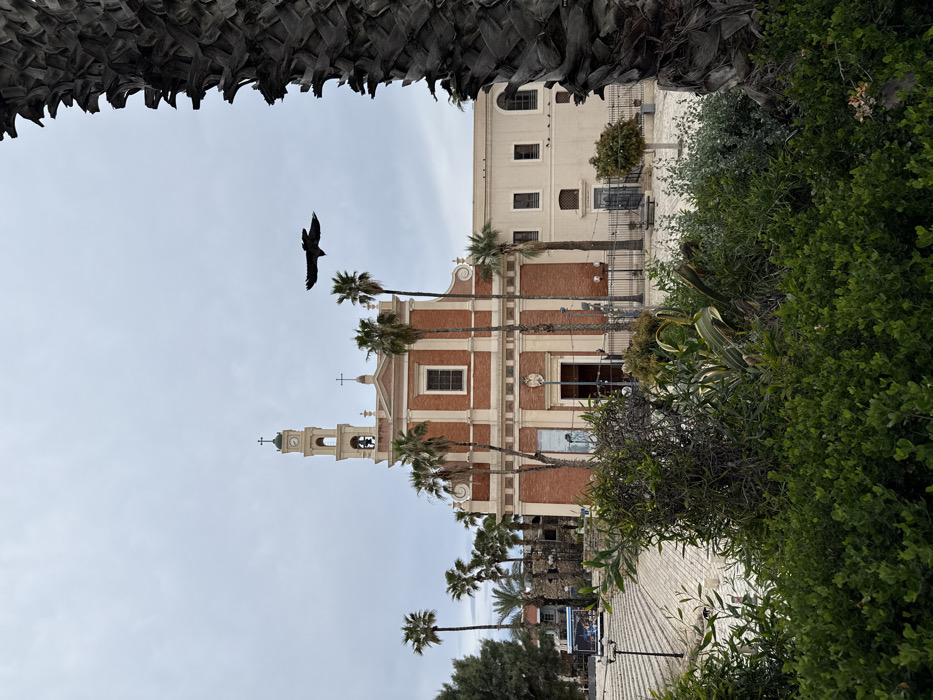 The image captures St. Peter's Church in Jaffa, Tel Aviv, Israel, under a uniform overcast sky. The church presents a facade of red brick contrasted with light-colored stone or plaster trim, featuring a central bell tower topped with a clock and a cross. Two additional crosses are visible on the roofline of the main structure. Numerous tall palm trees are positioned in front of and around the church building. A dark-colored bird with extended wings is in flight in the upper right quadrant of the sky. The immediate foreground is dominated by a dense arrangement of green shrubs and broad-leafed plants, partially obscuring the lower ground level. A large, dark, textured tree trunk, likely a palm, frames the far right edge of the composition. To the left, a paved plaza with a series of wide steps descends, and a black streetlight pole stands near the steps. A black metal fence with vertical bars encloses the church property. An attached cream-colored building with multiple windows is visible to the right of the main church structure, with several small dark specks, likely birds, perched along its roofline.