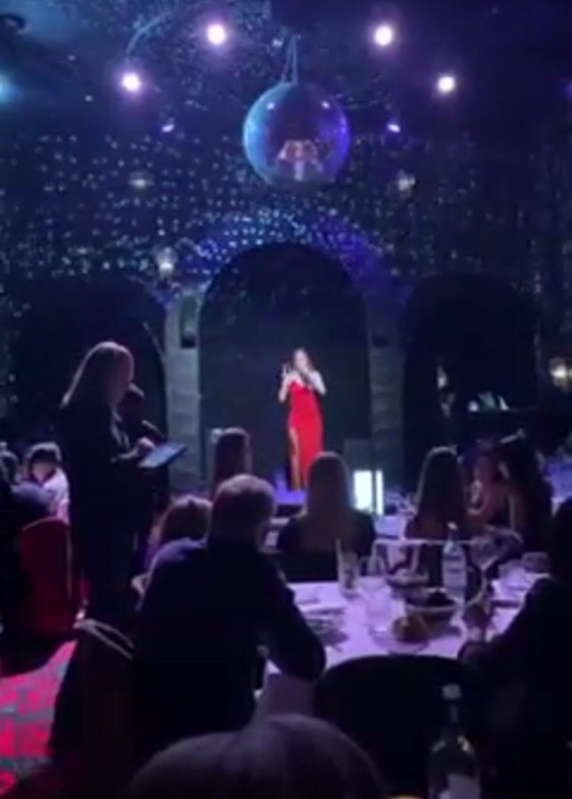 singer performing in a dimly lit room, likely a restaurant or event space, while people are seated at tables eating. The singer, wearing a red dress with a high slit, stands on a small stage under an archway and uses a microphone. Above her, a large disco ball hangs from the ceiling, which is decorated with a starry pattern. Several people are seated at tables in the foreground, with their backs to the camera. They seem to be enjoying a meal while listening to the performance. A woman in a black blazer stands to the left, holding a tablet. In the background, a waiter in a vest stands near the stage. The overall ambiance is festive and intimate.