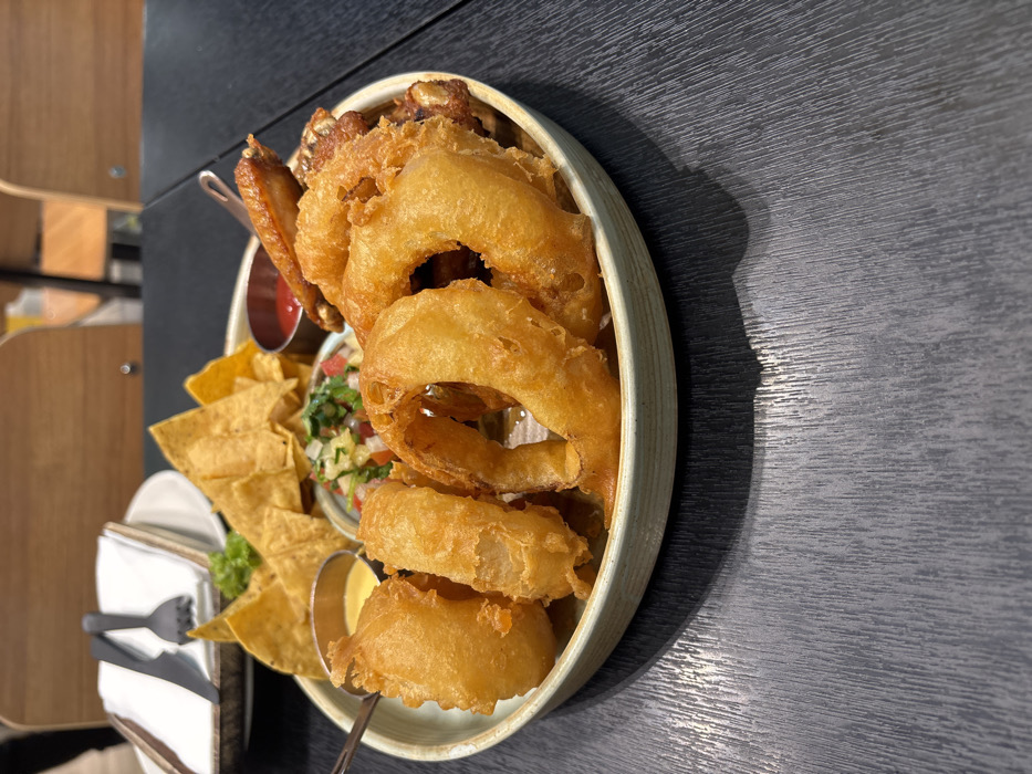 A platter of fried food sits on a dark table. Golden-brown onion rings dominate the view, accompanied by crispy chicken wings. Tortilla chips are arranged beside small bowls filled with salsa, ketchup, and a creamy dip. A stack of napkins, silverware, and a blurred chair are visible in the background. The plate's edge is light beige. The platter's placement casts a strong shadow on the table.