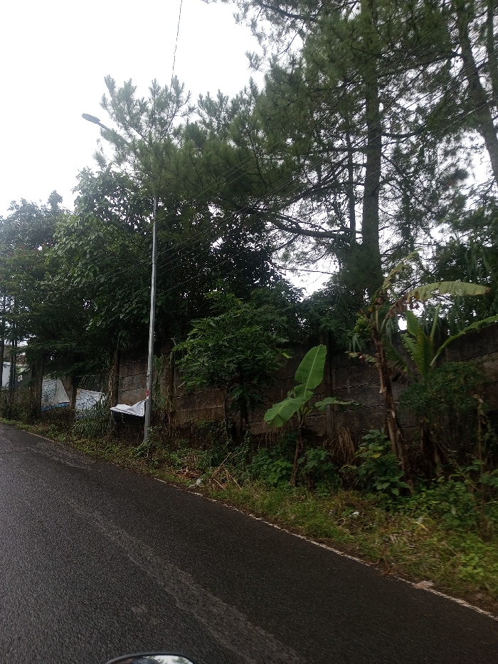 The image displays a roadside scene in Babaliya Mal., India. A dark asphalt road, appearing wet, occupies the lower left portion of the frame, with a faint white line along its right edge. A partial reflection from a vehicle mirror is visible at the bottom center. Adjacent to the road, a strip of unkempt ground features green foliage, dried vegetation, and scattered refuse. This area abuts a weathered, grey concrete block wall that extends horizontally across the midground. Sections of the wall have light-colored fabric or tarp-like material draped over them. A tall, slender grey streetlamp pole with a light fixture extends upwards from the ground beside the wall, slightly left of the image's vertical center. Behind the wall and rising above it, dense vegetation and numerous tall trees, including several pine-like trees with dark green needles and prominent trunks, dominate the upper and right portions of the scene. The sky is overcast and uniformly bright white. No individuals are present.