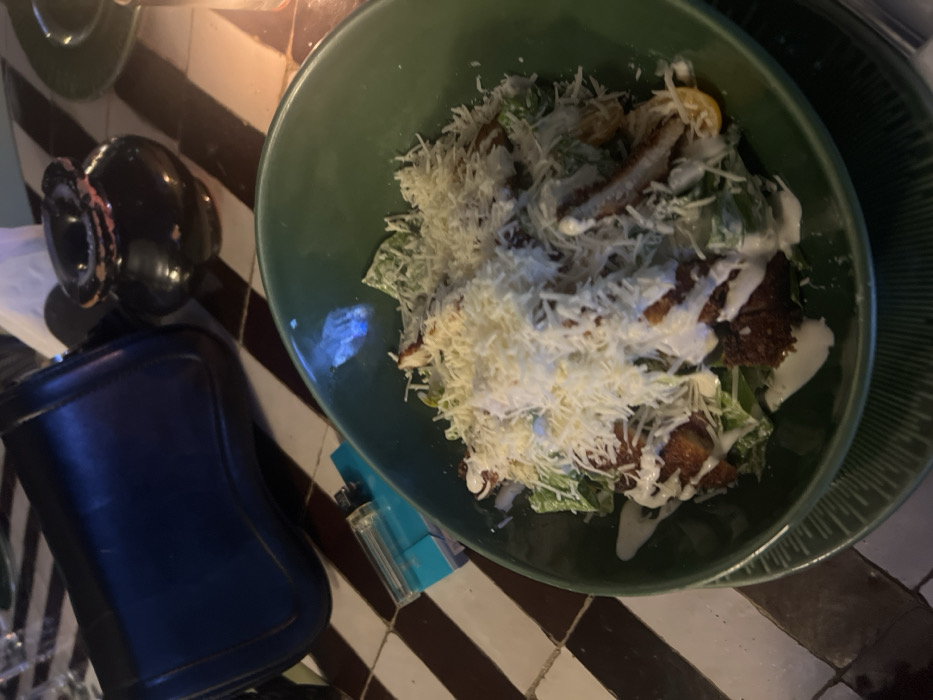 A green bowl holds a salad with greens, croutons, grated cheese, and dressing. Beside the bowl on a diagonally tiled surface are a blue purse, a small black vase, a glass, and a box. The salad appears to be a Caesar salad variant. Lighting is dim, creating shadows.