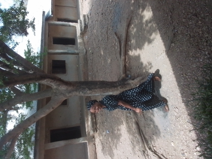 A woman with a patterned dress and headscarf stands outside a two-story building. The building has several windows and a balcony. A large tree with bare branches dominates the foreground, casting shadows on the ground and the woman. The ground is covered in dirt and gravel.