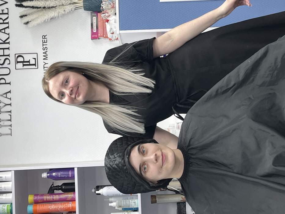 An indoor scene within a beauty salon in Chaikovsky, Russia, identified by the black text "LILIYA PUSHKAREVA BEAUTY MASTER" and "LP" logo on a white wall