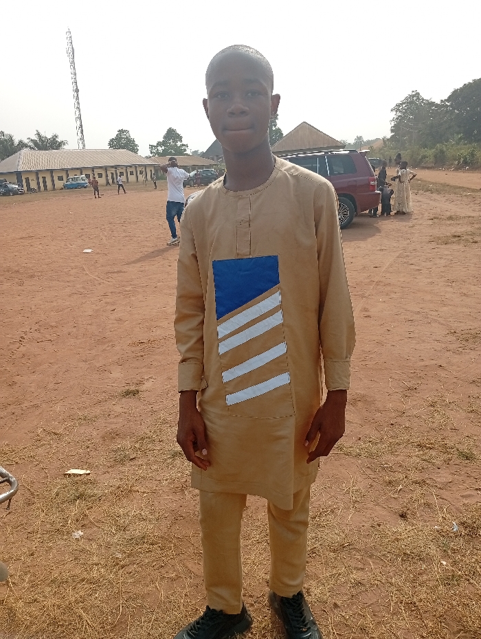 A young man stands on a dirt field wearing a tan tunic with a blue and white stripe design on the chest, and matching pants, and black shoes