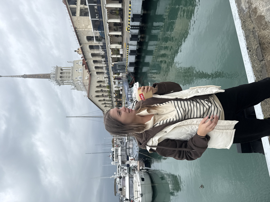 A young adult female is depicted standing on a concrete pier at the Sochi Sea Port in Sochi, Russia