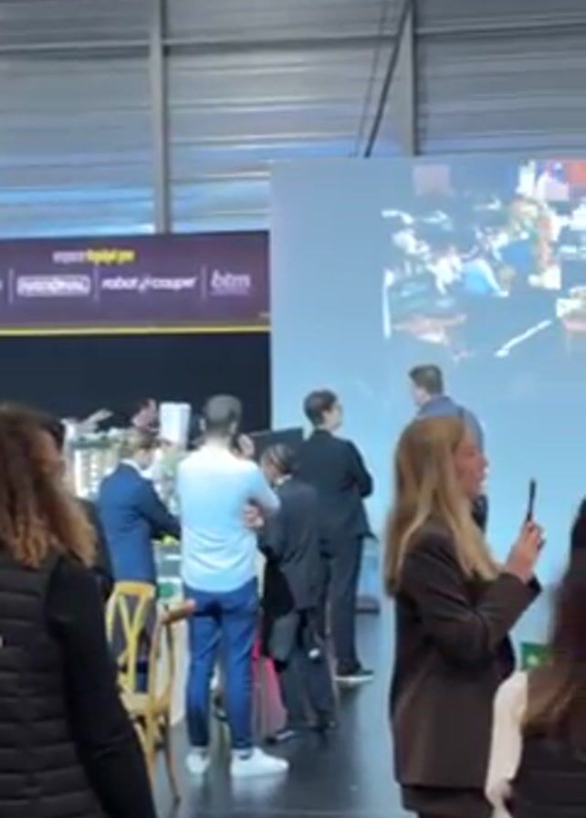 The video depicts an indoor event in what appears to be a large exhibition hall