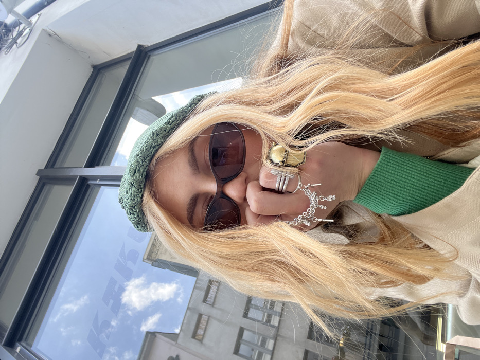 A low-angle, medium close-up photograph depicts an individual, likely female, with long blonde hair, wearing a green knitted beret and dark oval sunglasses