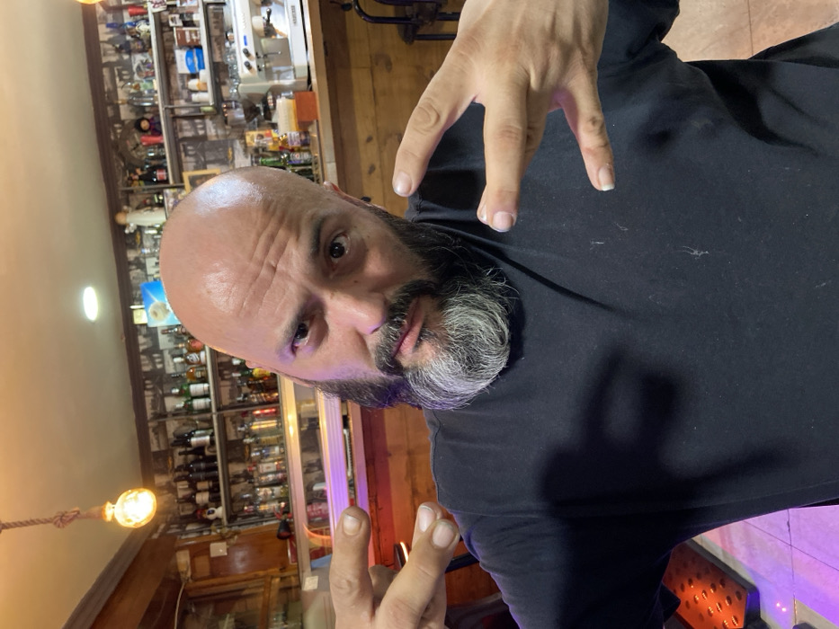 A bald, bearded man in a black shirt makes hand gestures toward the camera. He appears to be in a bar or restaurant setting, with shelves stocked with bottles visible in the background. The lighting is dim, with a few light fixtures providing illumination. The image is taken at a close-up angle, focusing on the man's face and hand gestures.