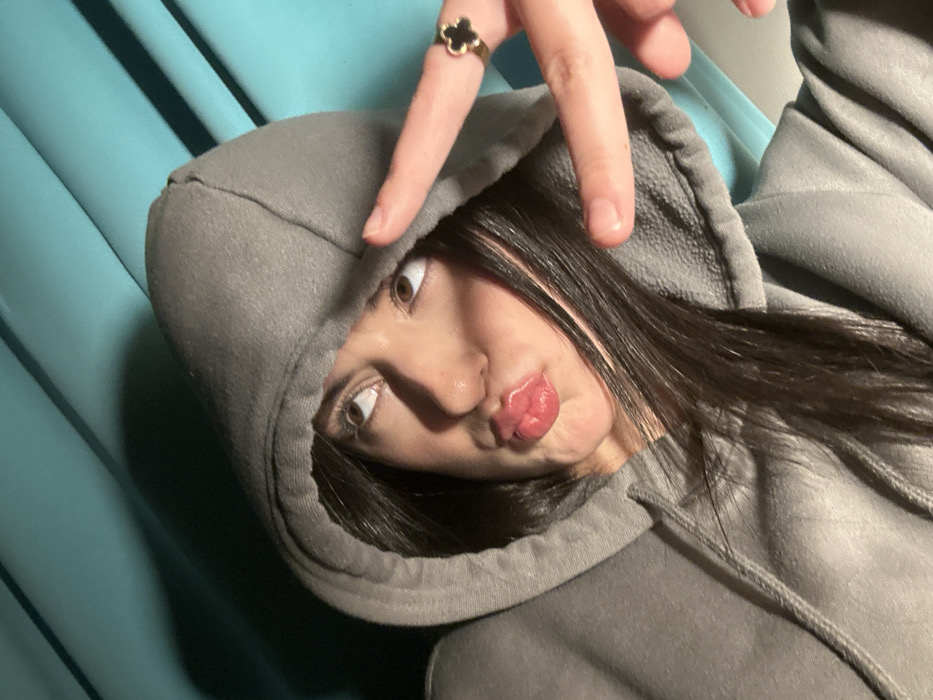 A person wearing a gray hoodie poses closely to the camera. The hood is pulled up, framing their face. They stick out their tongue slightly and their eyes are wide open. Their hand is raised above the hood in a peace sign. A ring with a four-leaf clover design is visible on their finger. A teal curtain drapes in the background.