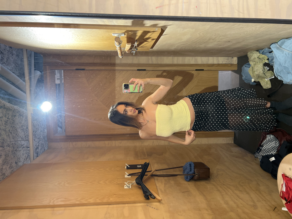 A young female is depicted taking a mirror selfie inside a retail fitting room, located in Paris, France. She stands centered, holding a smartphone with a green patterned case in her right hand, aimed towards her reflection. Her left hand is positioned on the waistband of her sheer black midi-skirt, which is adorned with white polka dots. She wears a light yellow, textured, strapless bandeau top and a silver-colored necklace with a small pendant. Her dark hair exhibits lighter ends. The fitting room walls are constructed from light-colored plywood panels with visible grain. The ceiling is rough, light-colored, and unfinished, displaying exposed pipes. A bright, single overhead light source, reflecting intensely in the mirror, illuminates the space. On the left wall, three white hooks support two dark plastic hangers and a brown leather-like cross-body bag containing a blue textured item. On the right side of the frame, a large mirror reflects a wooden rail with metal brackets and small metal hangers mounted on the wall. Various clothing items, including red fabric, black and white polka dots, denim-like material, and green textured fabric, are scattered on the dark floor around her.