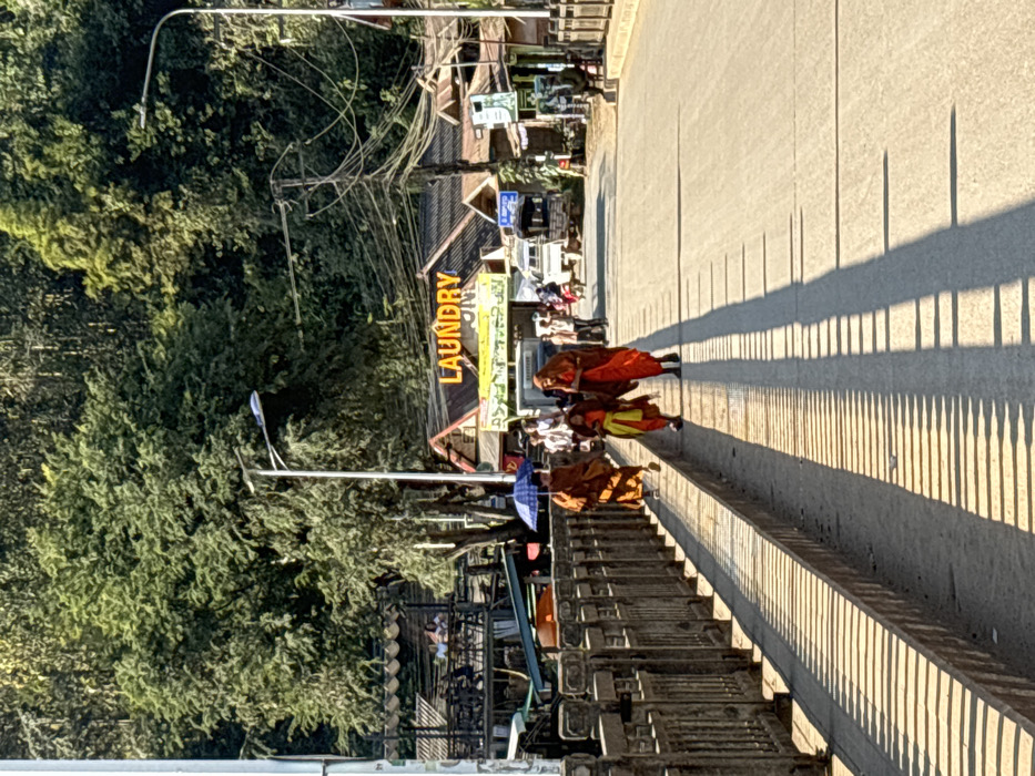 The image captures an outdoor urban scene in Sophoun, Laos, under direct sunlight, evidenced by prominent shadows. In the foreground, a multi-sectioned concrete barrier with decorative railings runs along the left, bordering a paved road that extends towards the background. Three individuals walk from left to right: on the barrier, a person in a saffron robe holds a blue umbrella; on the road, a child in a yellow and orange garment walks alongside a person dressed in a red-orange robe. Long, parallel shadows from the barrier stretch across the road. In the midground, a building with a multi-tiered roof features a large yellow sign displaying "LAUNDRY." To the right of this building, multiple structures with traditional-style roofs are visible, along with utility poles supporting a dense network of overhead wires. To the far left, behind the barrier, an elevated outdoor seating area hosts several people. The background is dominated by densely forested hills or mountains. Two modern streetlights are positioned along the road. Indistinct vehicles and pedestrians can be seen further down the street in the background.