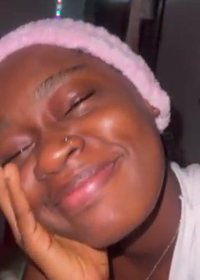 A young woman with dark skin and a pink headband smiles at the camera. She covers her face with her hand. The background shows a room with a door, hanging clothes, and a string of colored lights.