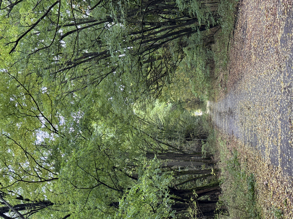 The image displays a straight, approximately 3-meter wide, asphalt or dirt path extending into the distance through a dense forest, characteristic of an overgrown area in the vicinity of Prypiat, Ukraine. The path surface is irregular, marked by scattered yellow and brown deciduous leaves, and exhibits darker, possibly damp, sections. Tall, primarily green-leafed deciduous trees form a dense, overarching canopy above the path, creating a natural tunnel. The undergrowth on both sides is thick, consisting of various bushes and smaller trees with mixed green and yellowish foliage. The path gradually narrows in perspective, leading to a brighter, less obscured area in the far distance. No human or animal subjects, vehicles, or structures are visible.