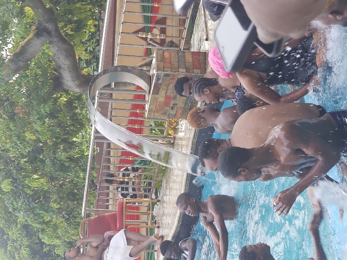 This image depicts a vibrant outdoor scene at a swimming pool in Onitsha, Nigeria, likely during a social gathering. **Environment:** The scene is set outdoors under natural daylight, with a clear blue swimming pool occupying the foreground and midground. Lush green foliage from trees is visible in the background, suggesting a tropical or well-vegetated location. A decorative metal railing, possibly stainless steel, runs along the perimeter of the pool area, adorned with red and green fabric or banners. A curved, modern water feature (fountain) continuously pours water into the pool from a brick base situated behind the railing. **People:** Approximately a dozen individuals, primarily young adults and adolescents of African descent, are present. Most are immersed in the pool, with several shirtless males and females in swimwear. * In the foreground and midground, multiple individuals are standing or moving in the water, creating splashes. One male in the foreground, facing away from the camera, is shirtless with dark swim trunks. Another male, partially visible on the left, also shirtless, splashes water. * Toward the right midground, a female wearing a black swimsuit and a pink shower cap is partially submerged, facing left, with water splashing around her. Another female with braided hair and a patterned bikini top is seen smiling towards the left. * A male with light-colored, possibly dyed, hair is visible near the water feature. * Outside the pool, on the left, a shirtless male in white shorts is seated on a red upholstered chair, facing left, with his right hand near his mouth. Another individual is partially visible crouching behind the railing in the background. **Objects & Actions:** * A metallic-looking smartphone in a dark case is held by an unseen person in the bottom right corner, partially obstructing the view, possibly used for recording or photography. * The water feature consistently discharges water, contributing to the lively atmosphere. * People in the pool are engaged in recreational activity, with water splashing indicating movement and interaction. * The overall atmosphere suggests leisure and enjoyment.