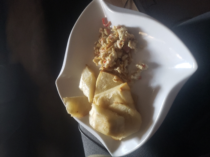 A white, irregularly shaped plate holds a simple meal. Scrambled eggs, speckled with bits of red pepper, occupy the upper right portion of the plate. To the left and below the eggs are several pieces of cooked yam or plantain. The pieces are golden brown, slightly oily and cut into irregular shapes. The plate rests on what appears to be a dark grey, possibly fabric-covered, surface.