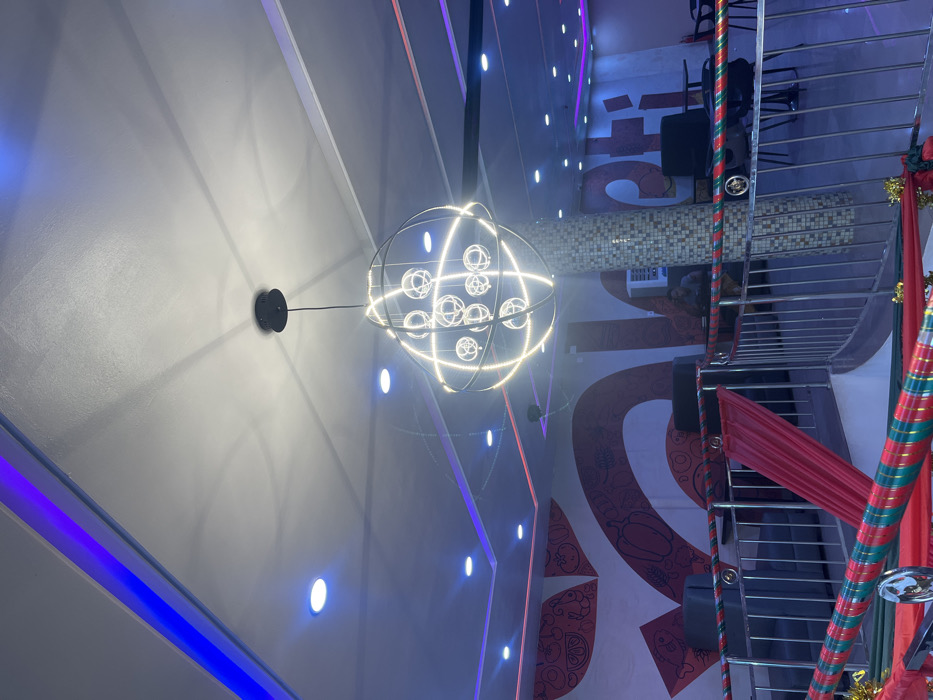 An indoor space featuring a modern, spherical chandelier with illuminated globes. The ceiling is white with blue neon strips and embedded spotlights. A mural adorns the wall, and metal stairs with a red garland and a red fabric drape are visible. Tables and chairs are present in the background.