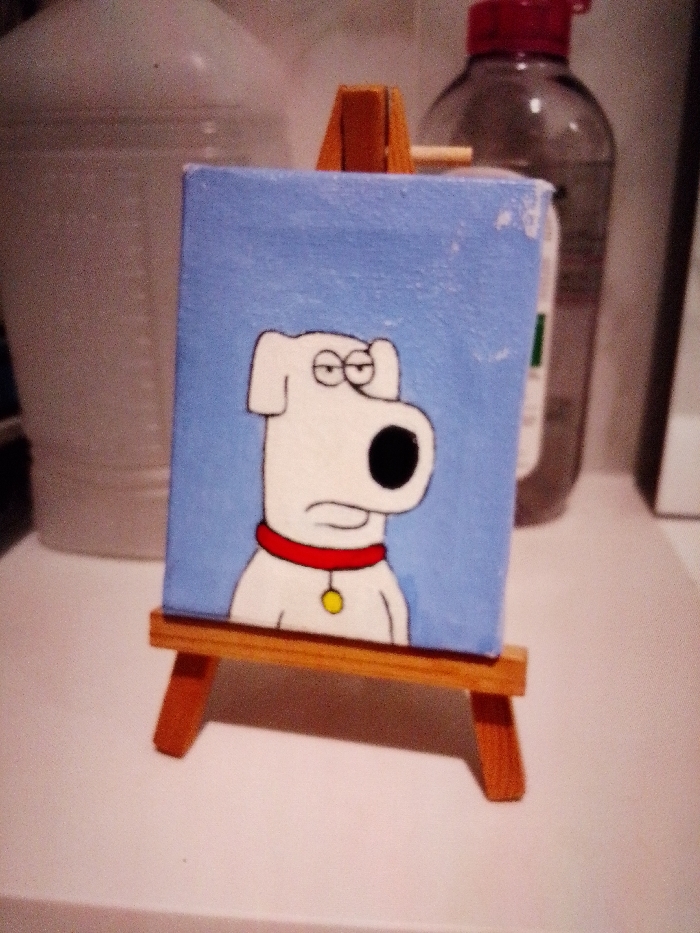 - "A miniature canvas painting depicting the cartoon character Brian Griffin from Family Guy is displayed on a small wooden easel" by FM-mu3Bo2, licensed under CC BY 4.0