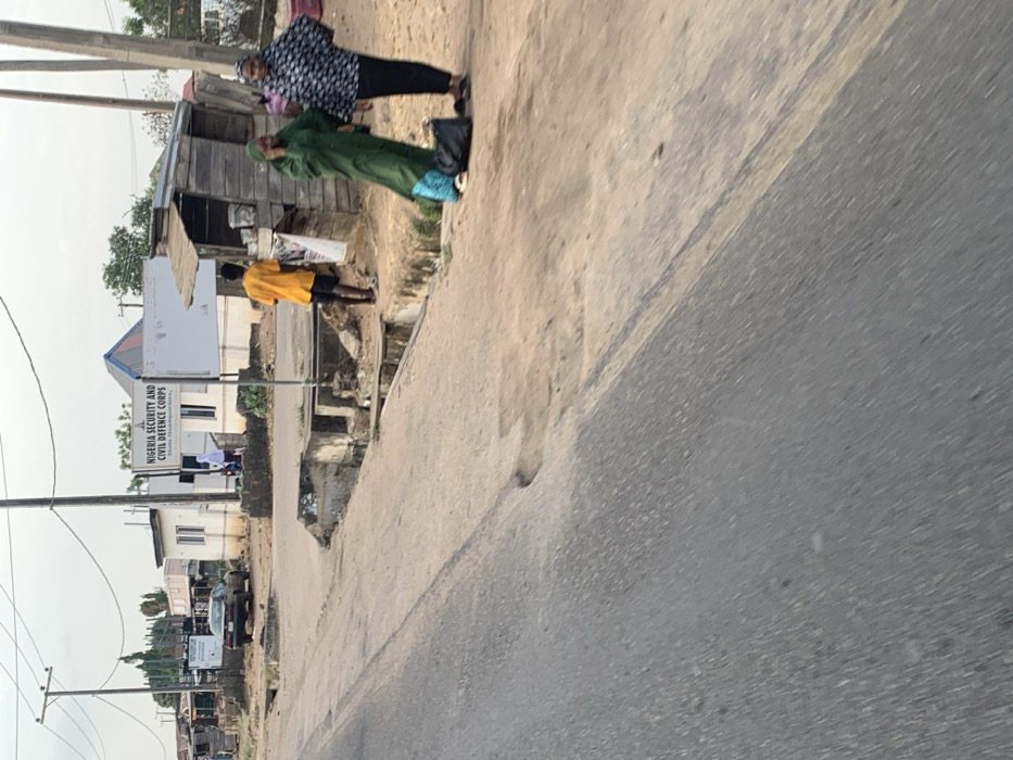 A street scene features a gray asphalt road taking up most of the frame. On the left, a sidewalk with people: one in a yellow shirt, another in a green robe, and another in a patterned top. Behind them, a building with a sign "NIGERIA SECURITY AND CIVIL DEFENCE CORPS." Utility poles and lines run along the street.