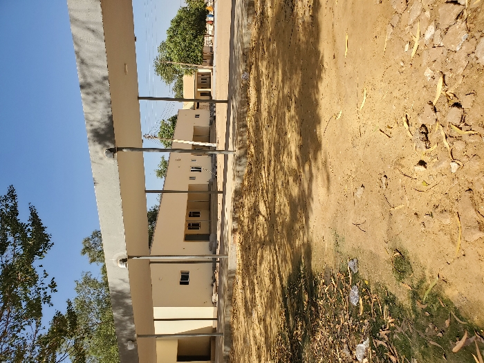 The image displays an outdoor scene in Kokani South, Nigeria, under a clear blue sky. The foreground consists of bare, light-brown earth, marked by scattered dry leaves, small stones, and visible fragments of plastic debris. Tree shadows are cast across the ground surface. A flat, light-colored covered walkway, supported by multiple dark cylindrical columns, spans the mid-ground, with light fixtures affixed to several columns. Behind the walkway, several single-story, light yellow-beige buildings are visible, each featuring flat roofs and multiple rectangular windows with dark frames. Additional buildings and green foliage from trees are present in the background. The scene is devoid of any individuals or discernible activity.