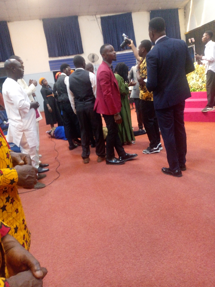 A group of people are gathered on a red carpeted floor in a large room. Some are dressed in formal attire, including suits and dresses. One man is taking a photo with a camera. Another man is wearing a red jacket, while someone is lying on the ground. The room has blue curtains and a raised platform with white flowers. The scene appears to be a formal event or ceremony.