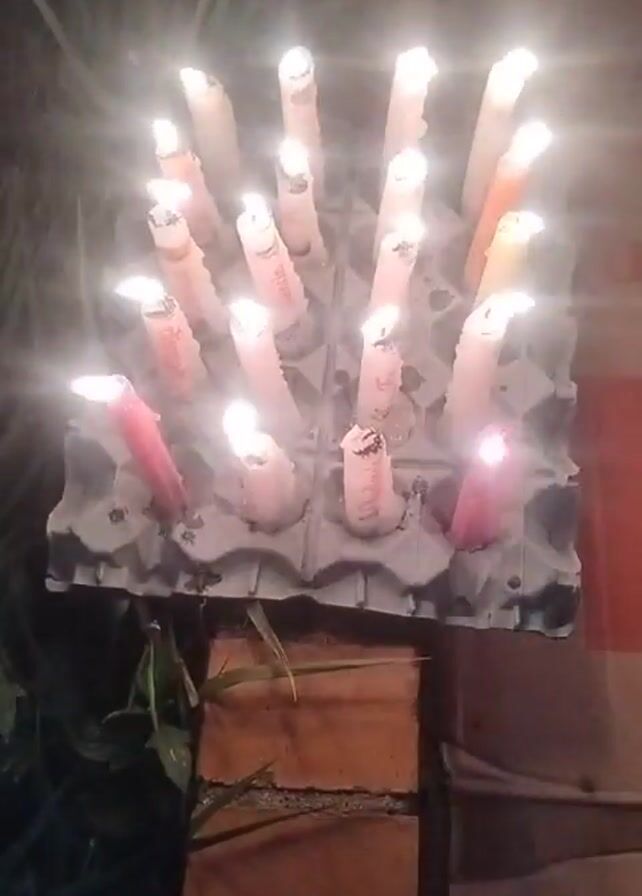 A video shows a collection of lit candles. The candles, most of which are white, are placed in the recessed slots of what appears to be a gray egg carton. The carton is balanced on a small brick column or pillar outside. The flames of the candles flicker in the wind. There are a few brightly colored candles interspersed throughout the arrangement, specifically in shades of red and orange. The lighting is dim, suggesting it is nighttime. Sparse foliage peeks into the scene from the left, and a blurry vertical red and white object is visible to the right.