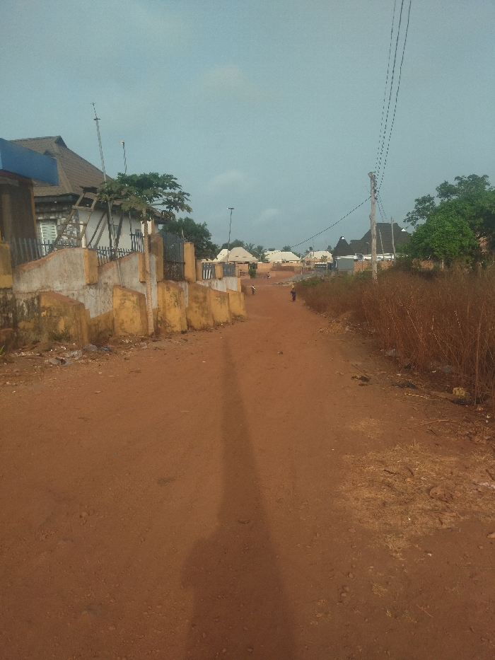 dirt road in Tuoniako, Nigeria. The road is lined with houses and fences. The houses have tiled roofs and the fences are made of concrete blocks. The dirt road is dusty and there are some shadows on the road. There are a few people walking on the road and trees on either side of the road. The sky is cloudy. The image was taken during the day. The road is the main focus of the image. The houses and fences are in the background. There is a power line running along the side of the road.