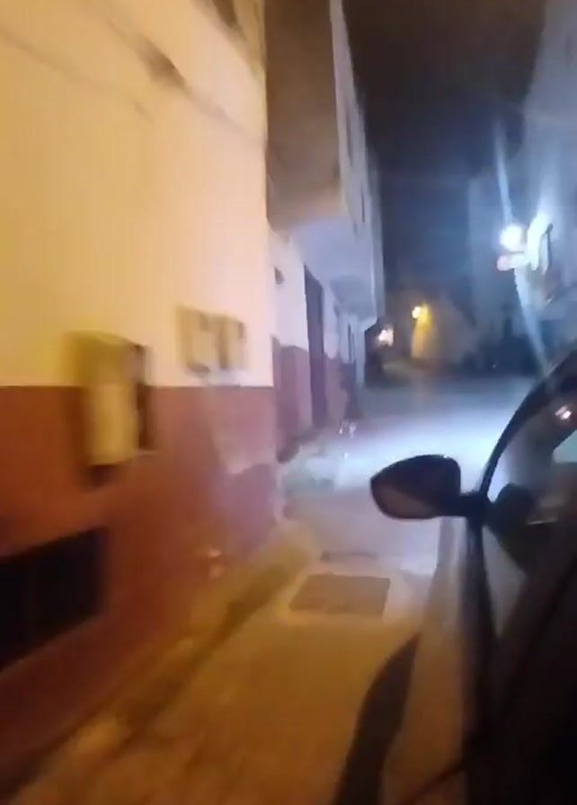 The video appears to be taken from the passenger seat of a car driving slowly down a narrow street at night