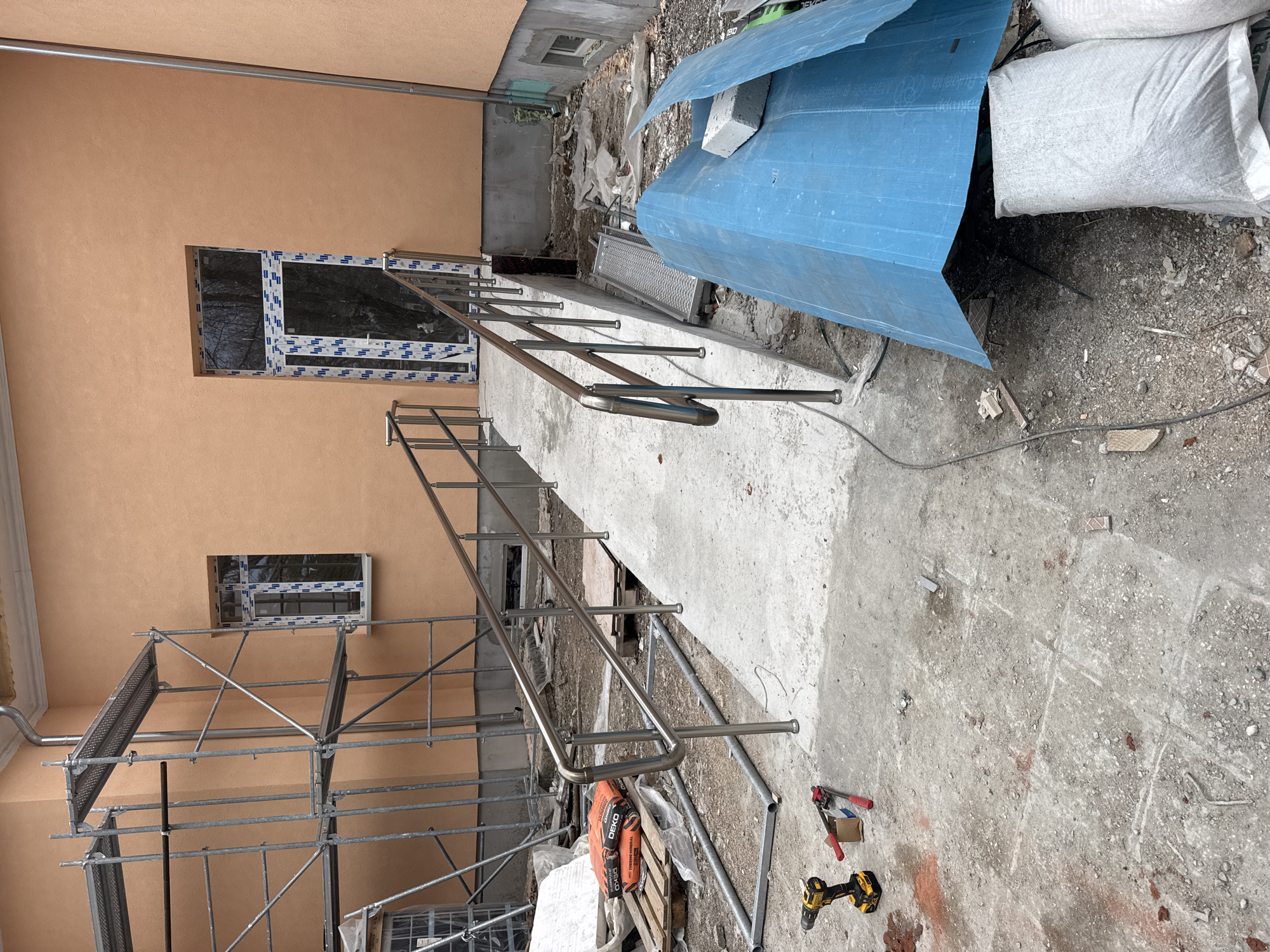 This image depicts an outdoor construction or renovation scene located in Madara, Bulgaria. The central focus is a newly constructed concrete accessibility ramp with polished stainless steel handrails, leading up to a building entrance. The building features a light orange-peach textured stucco facade. At the top of the ramp is a new white PVC-framed double door with dark glass panels, covered partially by blue protective film bearing white markings. To the left of the ramp's upper section, a white PVC-framed window, also covered in blue protective film, is set into the building wall. A silver-colored downspout is visible on the upper right side of the building. To the left of the ramp and window, a multi-tiered metal scaffolding structure stands against the building. The ground area surrounding the ramp is a disturbed, unfinished surface composed of dirt, gravel, and rough concrete patches. Various construction materials and tools are scattered across the ground. On the left, near the base of the scaffolding, a wooden pallet holds several orange-colored sacks labeled "DEKO THERMO MINERAL." Nearby are a yellow and black cordless drill and a pair of red-handled bolt cutters. To the right of the ramp, a large piece of blue corrugated plastic sheeting lies on the ground, partially covering debris, with a gray concrete block resting on it. Further to the right, several large white sacks, contents not specified, are visible next to the building's foundation. A segment of metal grating is visible within a trench-like area to the right of the ramp. No individuals are present in the scene, and no specific actions or interactions are depicted. The overall environment indicates ongoing construction work.